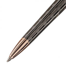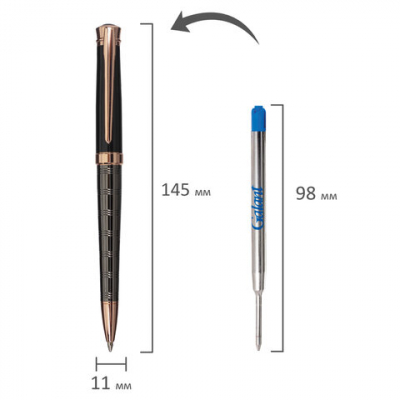 Утонченная модель ручки с корпусом из латуни цвета оружейного металла с черными элементами и золотистыми деталями. Синий цвет чернил; длина стержня составляет 98 мм, а диаметр пишущего узла - 0,7 мм. Поставляется в индивидуальном подарочном футляре. Подходит для гравировки.