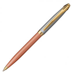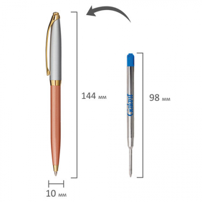 Утонченная модель ручки с корпусом из латуни розово-серебристого цвета и золотыми деталями прекрасно лежит в руке. Синий цвет чернил; длина стержня составляет 98 мм, а диаметр пишущего узла - 0,7 мм. Поставляется в индивидуальном подарочном футляре. Подходит для гравировки.