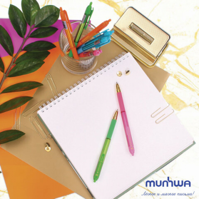 В ассортименте ручки в четырех ярких цветах корпуса: зеленый, оранжевый, розовый, голубой.