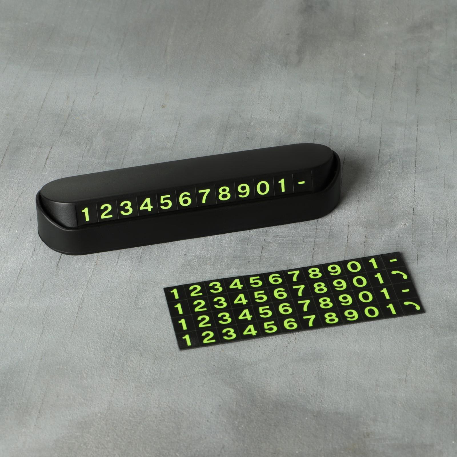 Аксессуар представляет собой автомобильную карту с цифрами, которые можно выставлять в необходимом порядке. Они крепятся на пластиковую основу с помощью магнитной ленты. На плашки с цифрами нанесено люминесцентное покрытие, которое позволяет увидеть номер телефона даже в темноте.