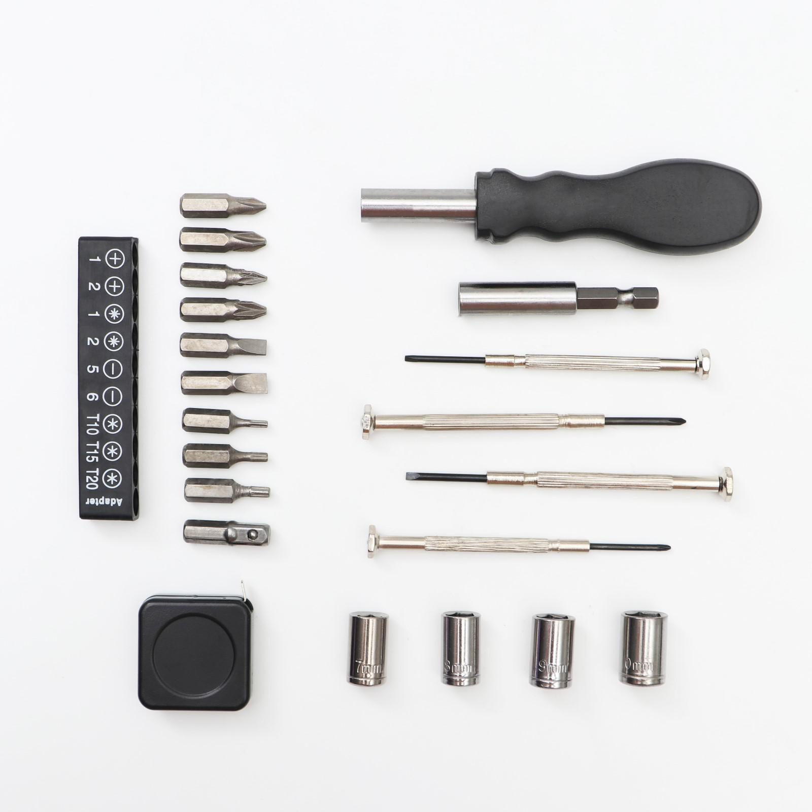 Возникли неполадки в пути? Нужно быстро исправить проблему? Откройте багажник и достаньте этот комплект. Там есть всё необходимое для современного водителя: отвёртки, набор бит (насадок), торцевые головки и рулетка. Также в комплект входит фонарь, чтобы вы смогли работать даже в темноте.