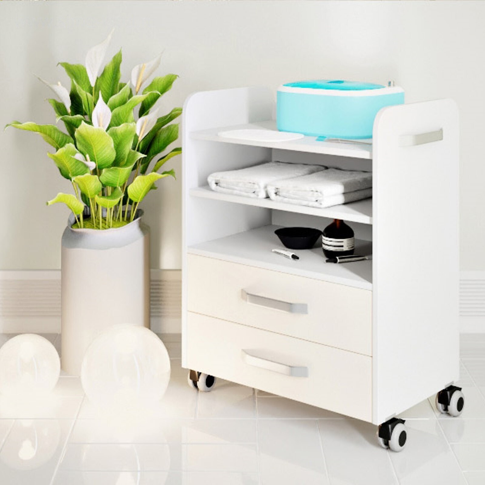 Педикюрная тумба ERGO BASIC оснащена бесшумными прорезиненными колесами два из которых оснащены стопорами. Внизу расположены два ящика полного выдвижения с шариковыми направляющими а сверху три вместительные полки.