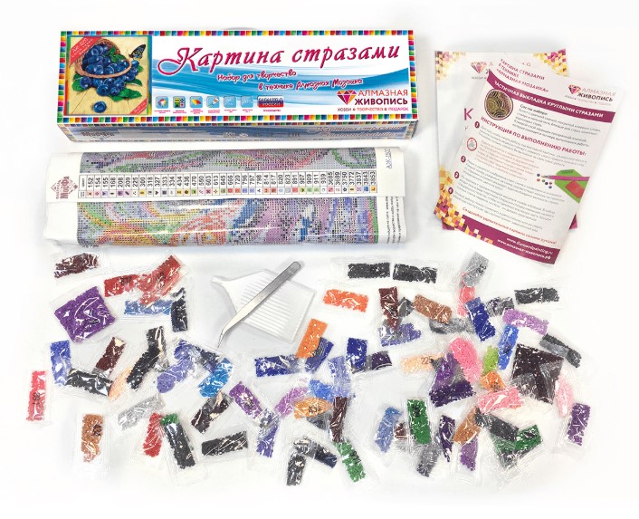 - Комплектация холст с изображением-схемой, акриловые стразы, пинцет, лоток для страз, подробная инструкция