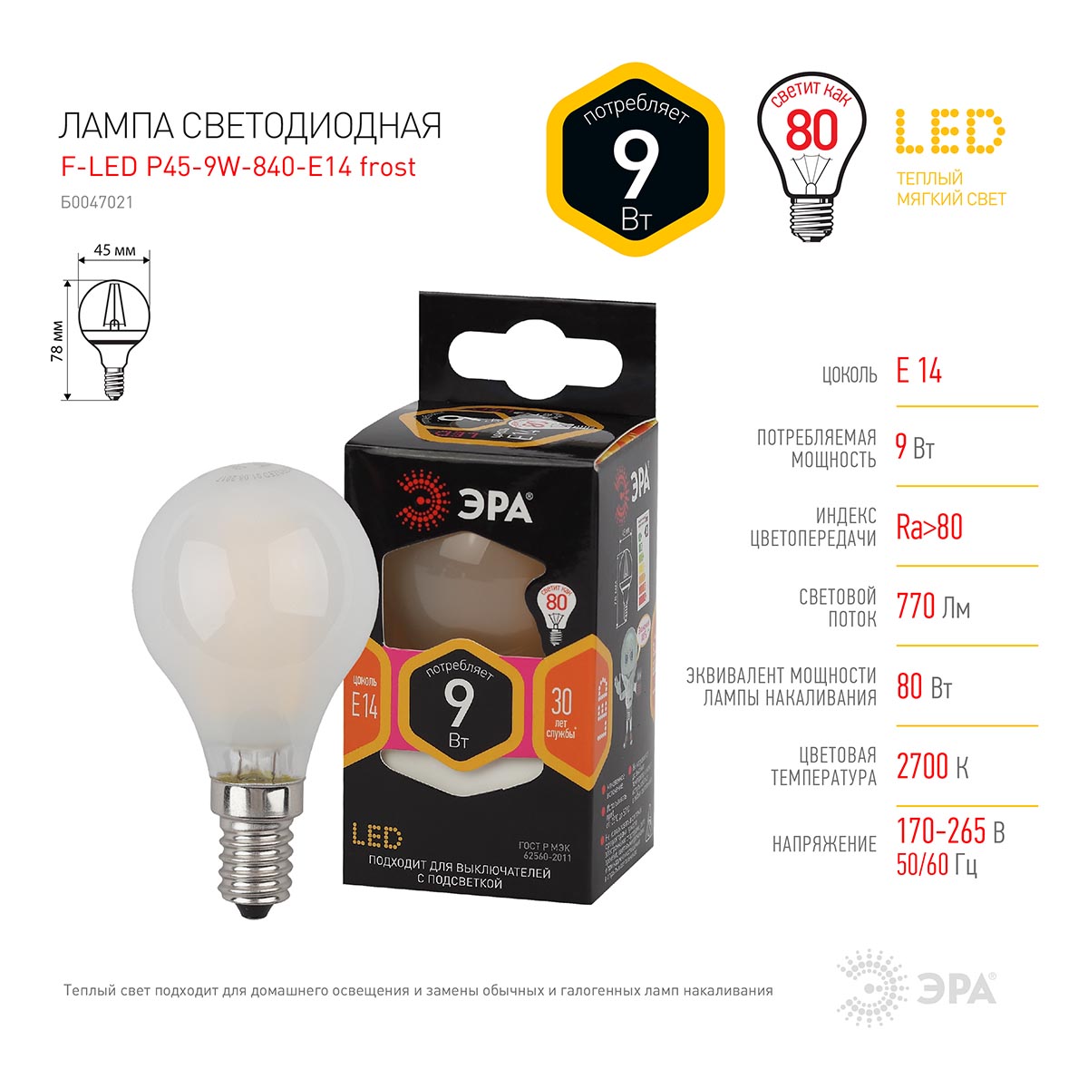 Лампа светодиодная филаментная ЭРА E14 9W 2700K ма... F-LED P45-9w-827-E14 frost