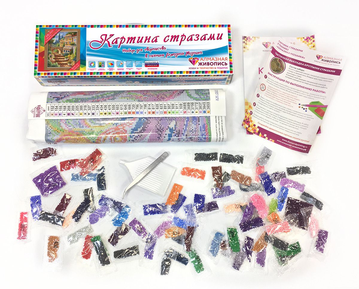 - Комплектация холст с изображением-схемой, акриловые стразы, пинцет, лоток для страз, подробная инструкция