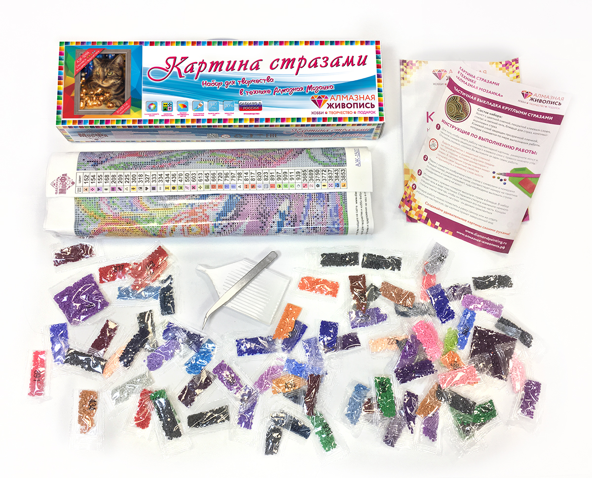 - Комплектация холст с изображением-схемой, акриловые стразы, пинцет, лоток для страз, подробная инструкция