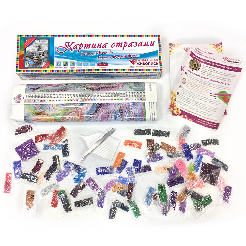 - Комплектация холст с изображением-схемой, акриловые стразы, пинцет, лоток для страз, подробная инструкция