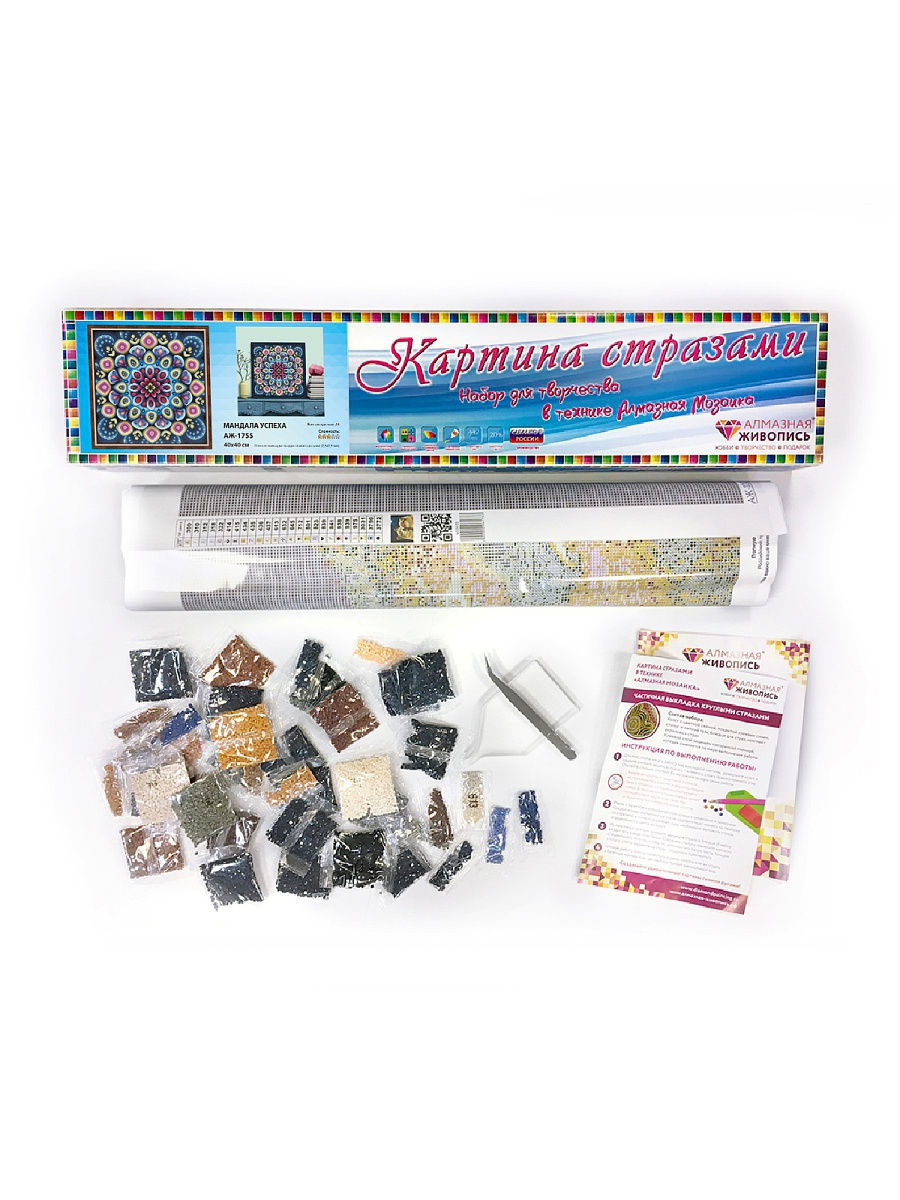 - Комплектация холст с изображением-схемой, акриловые стразы, пинцет, лоток для страз, подробная инструкция