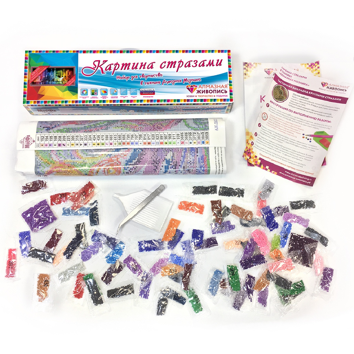 - Комплектация холст с изображением-схемой, акриловые стразы, пинцет, лоток для страз, подробная инструкция