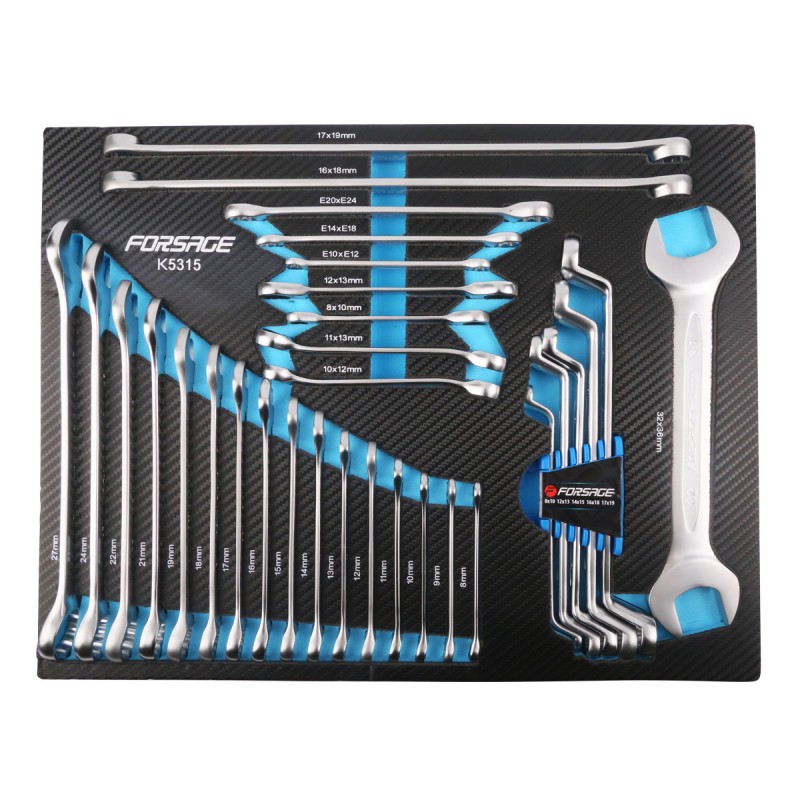 F-K5315 Набор ключей 31пр(комбинированные:8-27мм,накидные удл.-е:6-19мм,накидные:8-19мм,разр.-е:10-13мм,трещоточ-е:8-13мм,рожковый 32х36мм,Е10-Е24)в ложементе