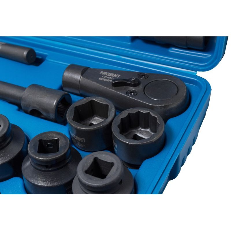 Особая прочность насадок данного комплекта позволяет использовать их при работе с мощными пневматическими и электрическими гайковертами, а также со стандартными воротками, трещотками и другими слесарно-монтажными приспособлениями. В набор инструментов ударных PROFI 26 пр. FK-68262-5MPB входят Г-образные воротки 200 и 490 мм, вороток для трещотки 500 мм, удлинитель - переходник 200 мм, адаптер с отверстием для воротка, трещотка на 24 зуба, а также комплект 6-ти и 12-гранных торцевых головок различных типоразмеров. Ударные торцевые насадки изготавливают из высокоуглеродистых марок стали мелкозернистой структуры - их легко отличить от обычных головок по характерному матовому черному цвету. Набор ударных торцевых головок и инструментов FORCEKRAFT 26 предметов могут применять в работе как профессионалы, так и владеющие навыками обслуживания и ремонта автомобилей любители. Для удобства хранения и транспортировки данный комплект инструментов отпускается в прочном пластиковом кейсе.