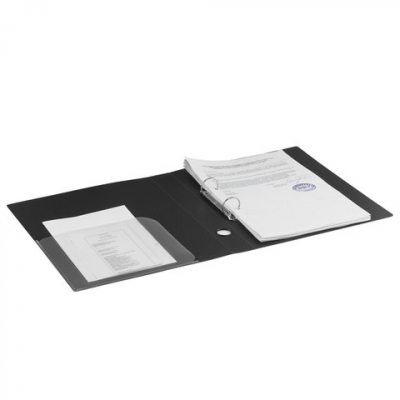 Папка стандартного формата А4 вмещает до 300 листов. Изготовлена из пластика толщиной 0,9 мм с оригинальной диагональной фактурой. Допускается влажная обработка поверхности. Внутренняя сторона обложки снабжена прозрачным карманом. Ширина корешка составляет 40 мм. Папка оснащена двумя кольцами, которые обеспечивают надежное хранение документов. В неё можно вставить файлы или проколотые дыроколом листы и, при необходимости, заменить их на другие. Каждая папка упакована в индивидуальный пакет.