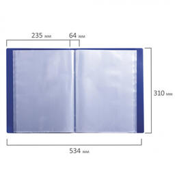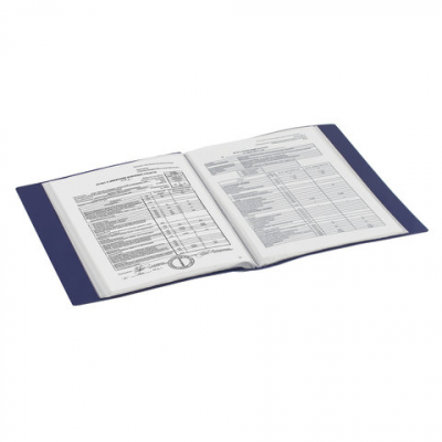 На корешке имеется карман для маркировки содержимого. Папка изготовлена из качественного пластика толщиной 0,9 мм с антибликовой диагональной фактурой, а ширина корешка составляет 64 мм. Содержит 100 вкладышей, позволяющих хранить документы формата А4 и обеспечивающих их надежную защиту от попадания влаги, пыли и прочих повреждений. Поставляется в индивидуальной упаковке.