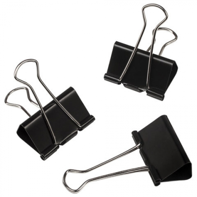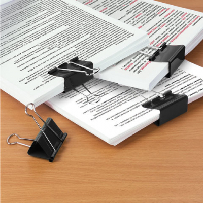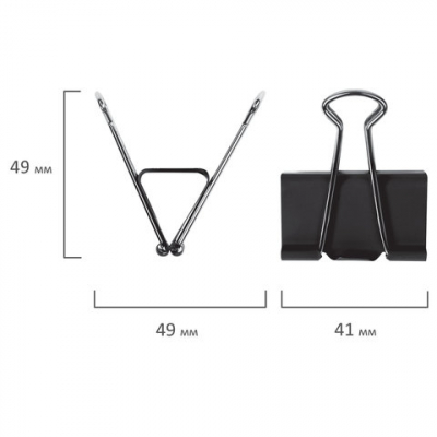 Изготовлены из стали с черным покрытием. Позволяют скреплять до 200 листов. Не деформируют бумагу. Ширина зажима - 41 мм. Поставляются по 12 штук в картонной коробке.