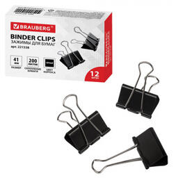 Зажимы для бумаг BRAUBERG, КОМПЛЕКТ 12 шт., 41 мм, на 200 листов, черные, картонная коробка, 221538