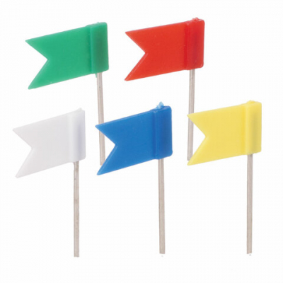 Булавки размером 35 мм изготовлены из металла и имеют цветные пластиковые шляпки в виде флажков. 50 штук в пластиковой упаковке с европодвесом.