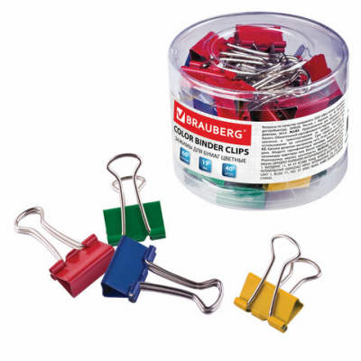 Зажимы для бумаг BRAUBERG, КОМПЛЕКТ 40 шт., 19 мм, на 60 листов, цветные, в пластиковом цилиндре, 221127