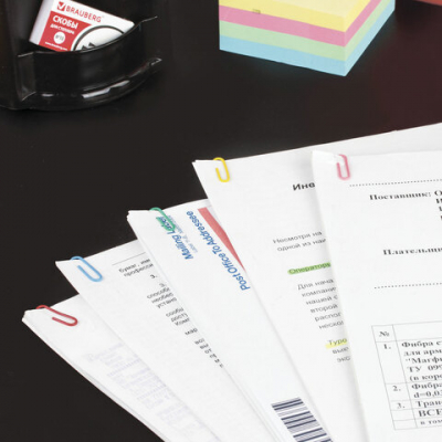 Скрепки изготовлены из стали, имеют классическую овальную форму и цветное пластиковое покрытие. Длина скрепки составляет 28 мм. Не окисляются и не повреждают документы. 100 штук в пластиковой коробке.