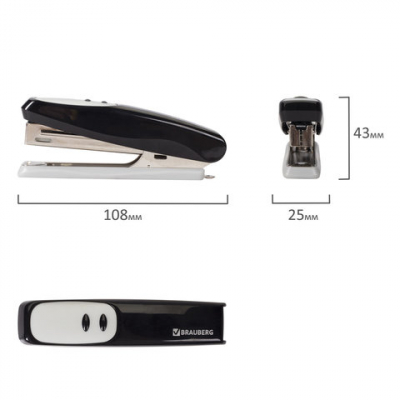 Настольный степлер BRAUBERG "Germanium" с антистеплером в черно-сером корпусе с металлическим механизмом cпособен скрепить до 12 листов. Подходящий размер скоб № 10. Виды сшивания: закрытый, прямой. Глубина закладки бумаги - 54 мм. Габариты: высота - 43 мм, ширина - 25 мм, длина - 108 мм. Благодаря компактным размерам удобен в использовании и занимает мало места на рабочем столе, а классический дизайн делает степлер подходящим к любому интерьеру. Продается в картонной упаковке. ГАРАНТИЯ 5 ЛЕТ!