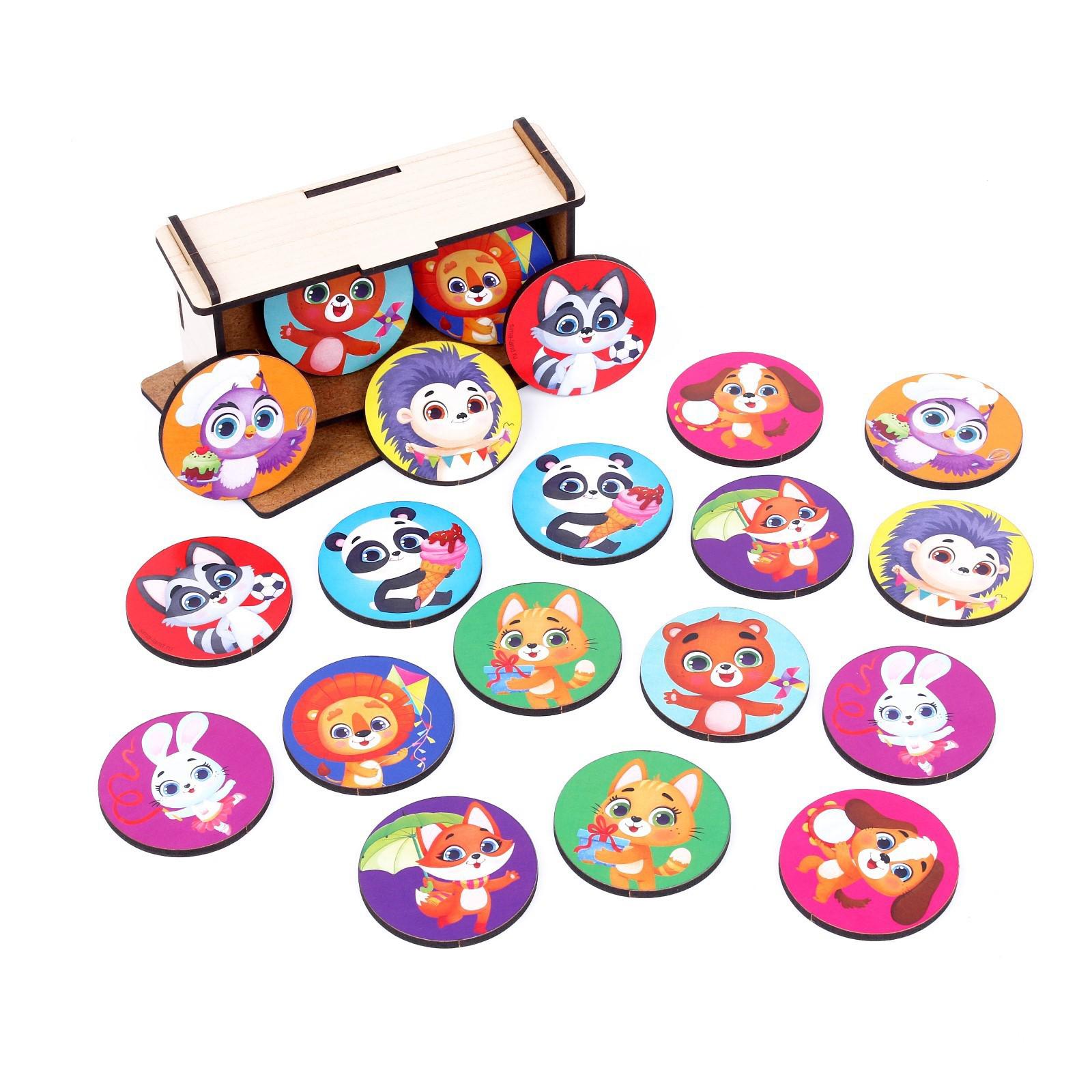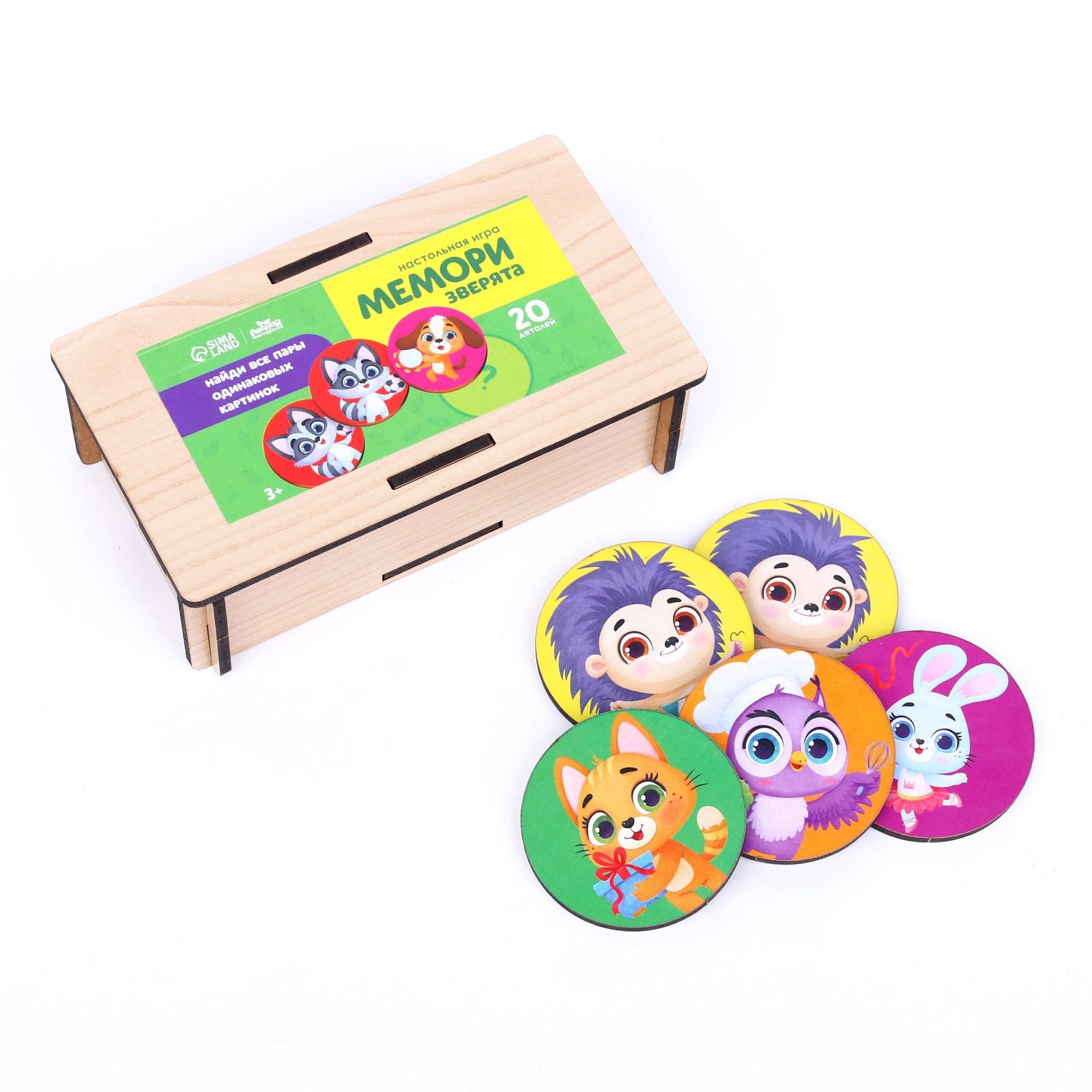 Мемори представляет собой набор из 20 деталей. Фигурки сделаны из дерева, поэтому очень прочные. В деревянном кейсе удобно хранить детали.