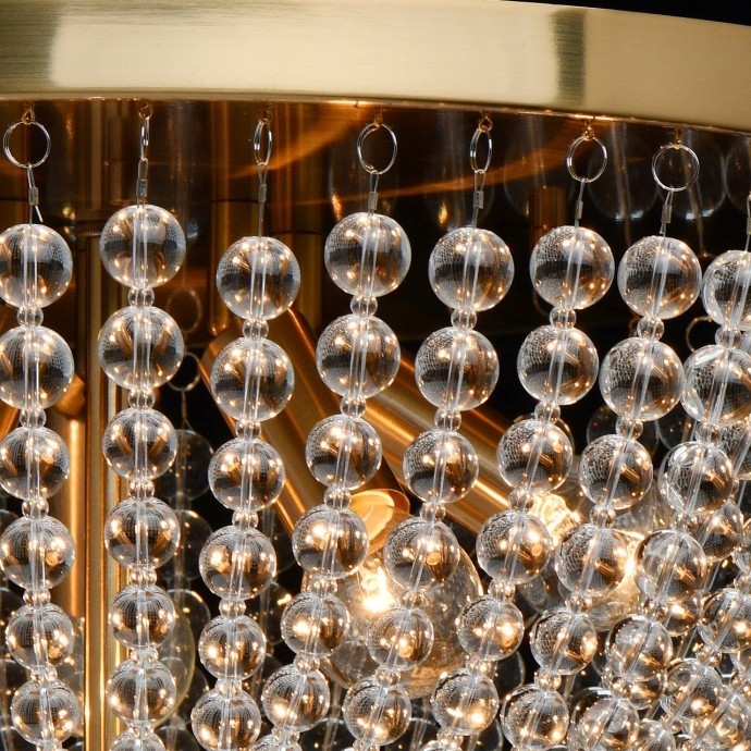Основание светильника выполнено из металла и гальванизировано в цвет латуни. Светильник декорирован бусами из прозрачного хрустального стекла.