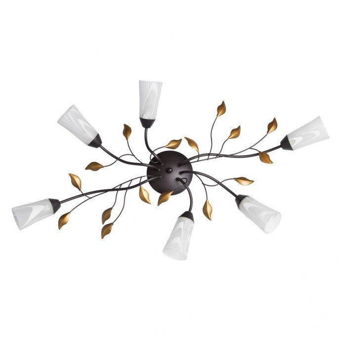 Основание: металл, окрашивание в коричневый цвет. Рожки и завитки выполнены по технологии проката на роликовом станке. Плафоны: стекло отлитое в форму, матирование, ручное окрашивание по поверхности. Декор: растительные элементы из металла, окрашивание в цвет золота.