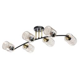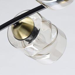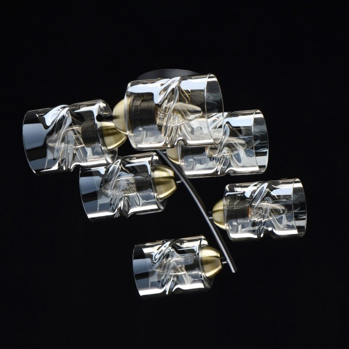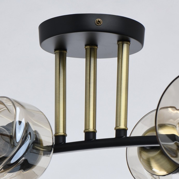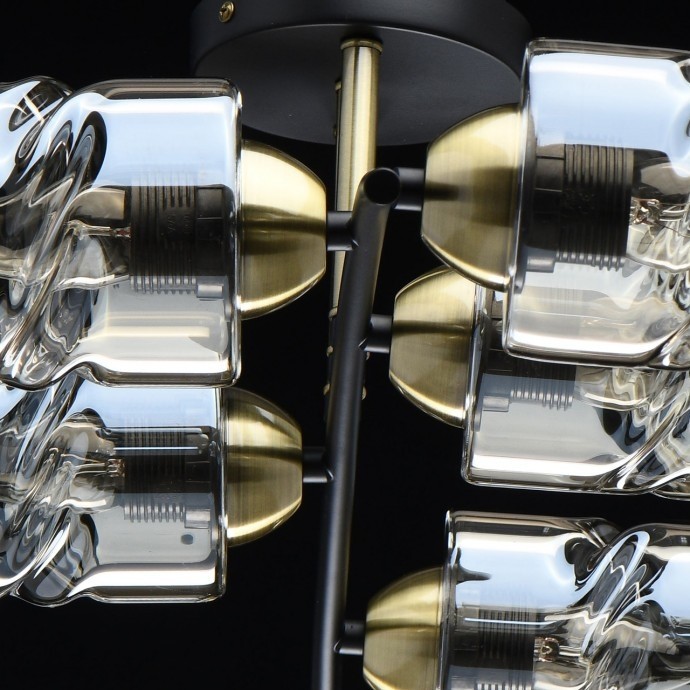 Основание светильника выполнено из металла и окрашено в черный цвет. Отдельные элементы основания гальванизированы в цвет латуни. Стеклянные плафоны отлиты в сложную форму и гальванизированы в цвет шампань.