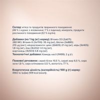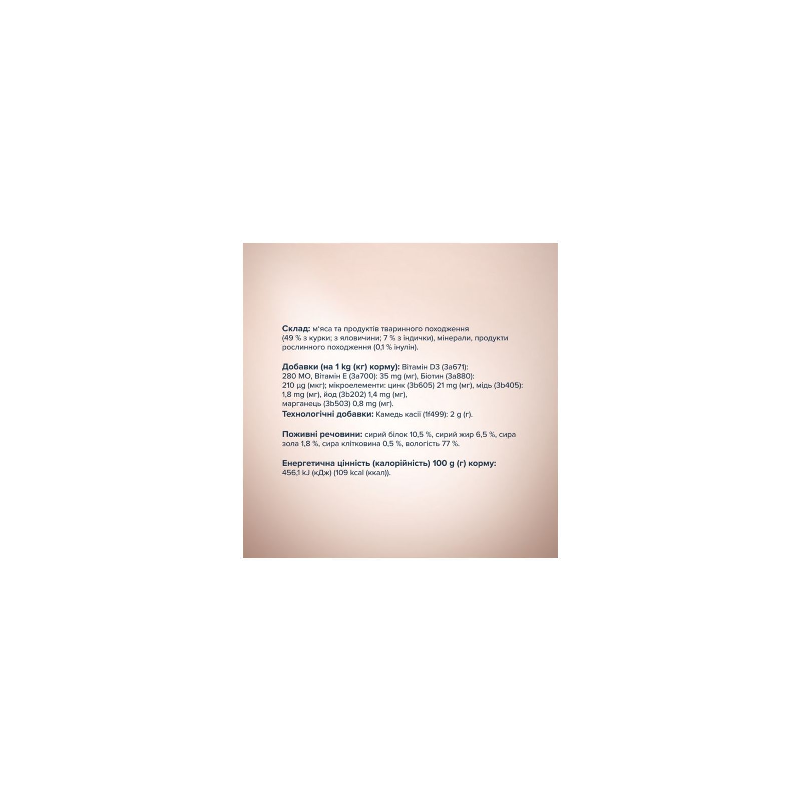 Склад: м‘яса та продуктів тваринного походження (49 % з курки; з яловичини; 7 % з індички), мінерали, продукти рослинного походження (0,1 % інулін).