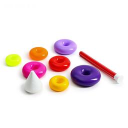 Каждое кольцо разного цвета и пронумеровано. Собирая пирамидку, ребёнок освоит основные цвета радуги и получит базовые навыки счёта. Игры с красочной пирамидкой разовьют у крохи мелкую моторику, координацию движений, воображение, логическое и образное мышление, навыки конструирования. Он научится различать предметы по величине, сравнивать их и делать выводы. Также юный конструктор познакомится с такими понятиями, как «больше», «меньше», «круг», «конус», «плоский», «объёмный».