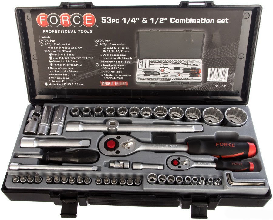 Набор из 53 предметов: Торцевые головки 1/2 (12 предметов); Торцевые головки 1/4 (9 предметов); Трещотка 1/2 , 1/4 ; Кардан 1/2 , 1/4 ; Удлинители 1/2 ; Удлинители 1/4 ; Головки свечные 1/2 ; Переходник 3/8 (F)x1/2 (M); Угловые ключи шестигранные (4 предмета); Отвертка под биты; Биты (насадки-отвертки) 28 (Hex, Torx, Phillips, Slotted).