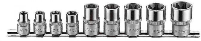 Набор, включающий в себя 9 предметов: Торцевые головки Torx (Е-профиль) 3/8 , длина 28 мм, размеры: E10; E11; E12; E14; Торцевые головки Torx (Е-профиль) 1/2 , длина 38-40 мм, размеры: E16; E18; E20; E22; E24.