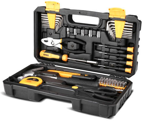Набор из 62 предметов: Торцевые головки 1/4 (5 предметов); Угловые ключи шестигранные (16 предметов); Пассатижи; Рулетка 3 м; Молоток; Ножницы; Нож; Отвертки (4 предмета); Отвертка под биты; Биты (насадки-отвертки) 30 (Hex, Torx, Phillips, Pozidriv, Slotted); Адаптер для бит.