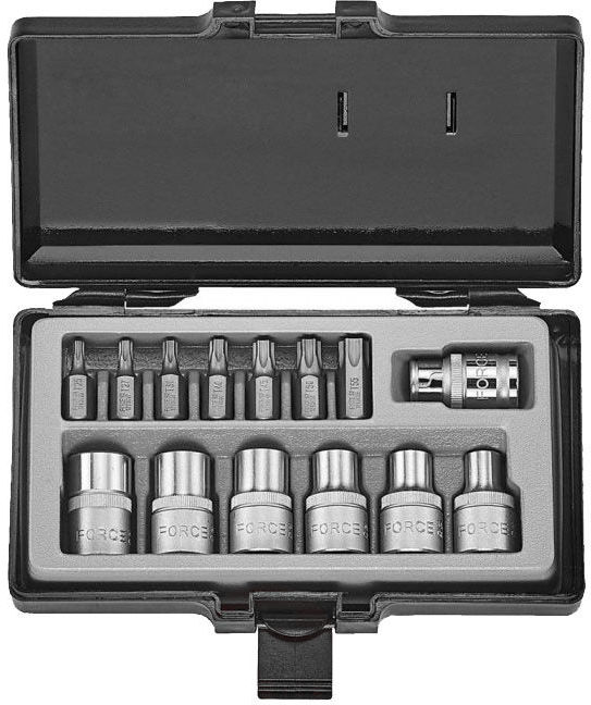 Набор, включающий в себя 14 предметов: Торцевые головки Torx (Е-профиль) 1/2 (6 шт.), длина – 38 мм., размеры: E10; E12; E14; E16; E18; E20; Биты Torx (Е-профиль) 1/2 (7 шт.), длина – 30 мм., размеры: T25; T27; T30; T40; T45; T50; T55; Держатель биты 1/2 x 10 мм., длина – 38 мм.