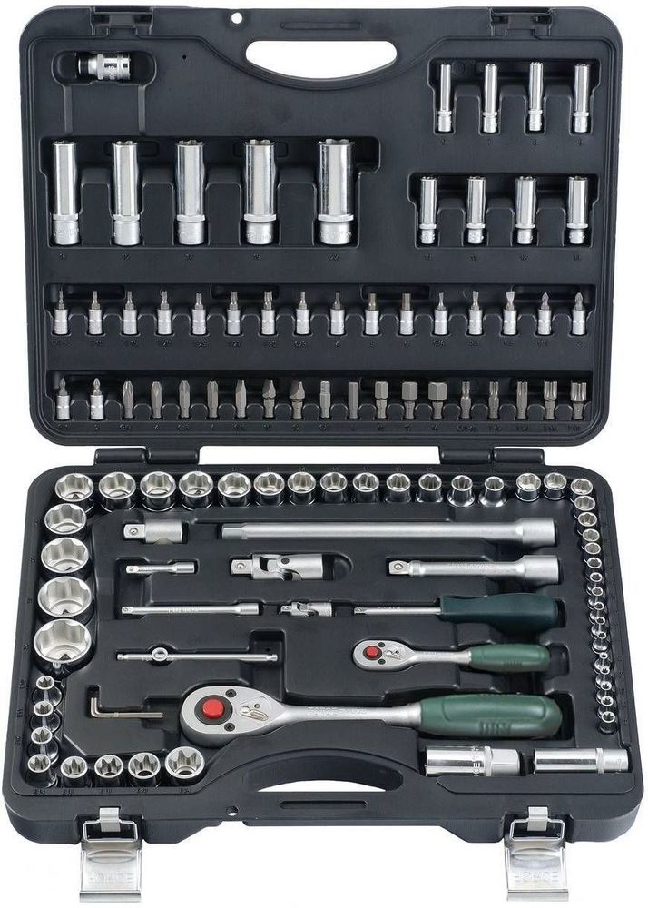 Набор из 108 предметов: Торцевые головки 1/2 (17 предметов); Торцевые головки 1/4 (13 предметов); Глубокие торцевые головки 1/2 (5 предметов); Глубокие торцевые головки 1/4 (8 предметов); Торцевые головки 1/2 Е-тип (8 предметов); Торцевые головки 1/4 Е-тип (5 предметов); Трещотка 2 (1/2 , 1/4 ); Т-образный вороток 1/4 ; Кардан 1/2 , 1/4 ; Удлинители 1/2 ; Удлинители 1/4 (2 предмета); Головки свечные 1/2 (2 предмета); Вороток шарнирный 1/2 ; Переходник; Угловые ключи шестигранные (3 предмета); Отвертка под биты; Биты (насадки-отвертки) 17 (Hex, Torx, Phillips, Pozidriv, Slotted); Головки со вставкой 18 (1/4 )..