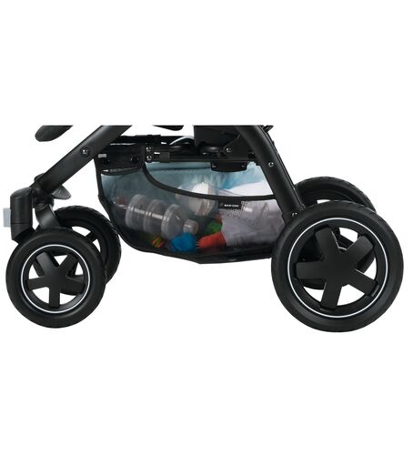 На тыльной стороне сиденья предусмотрен карман для необходимых вещей. Капор в непогоду удлиняется с помощью молнии, смотровое окно позволяет сохранять постоянный зрительный контакт с малышом. Съемный бампер т-образной формы выполняет защитную функцию, не ограничивая движения ребенка.