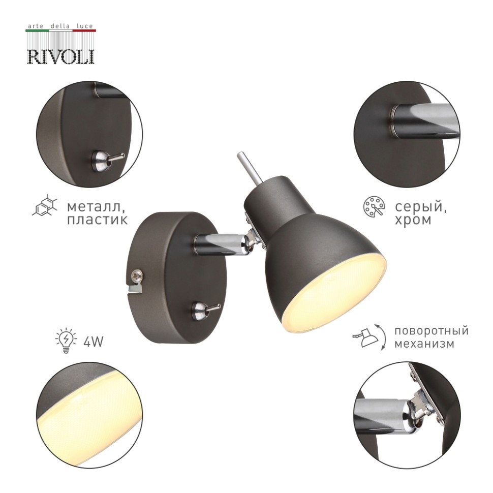 Rivoli Renata - аккуратное поворотное LED бра серого цвета с хромированным выключателем и хромированными деталями. Размеры бра - 123*80*112 мм. Компактные и стильные настенные светильники помогут вам оформить интерьер в соответствии с современными трендами. Для этого современного бра не нужна лампа, освещение создают встроенные светодиоды. Экономичные и стильные бра настенные от итальянских дизайнеров вы можете купить по доступной цене. Температура освещения - 3200 К. Это белый дневной свет с небольшим уклоном в сторону теплого рассветного. Такое освещение психологи характеризуют как максимально комфортное для жилых помещений. В комнате с бра Rivoli Renata на стене вам будет уютно, глаза будут меньше уставать. Это функциональный и красивый светильник-бра в спальню, детскую, прихожую, гостиную. В дизайнерской коллекции светильников настенно-потолочных Rivoli Renata вы найдете бра над кроватью, бра в спальню, бра в гостиную в сером (арт. 6158-701) и черном (арт. 6158-703) цвете.