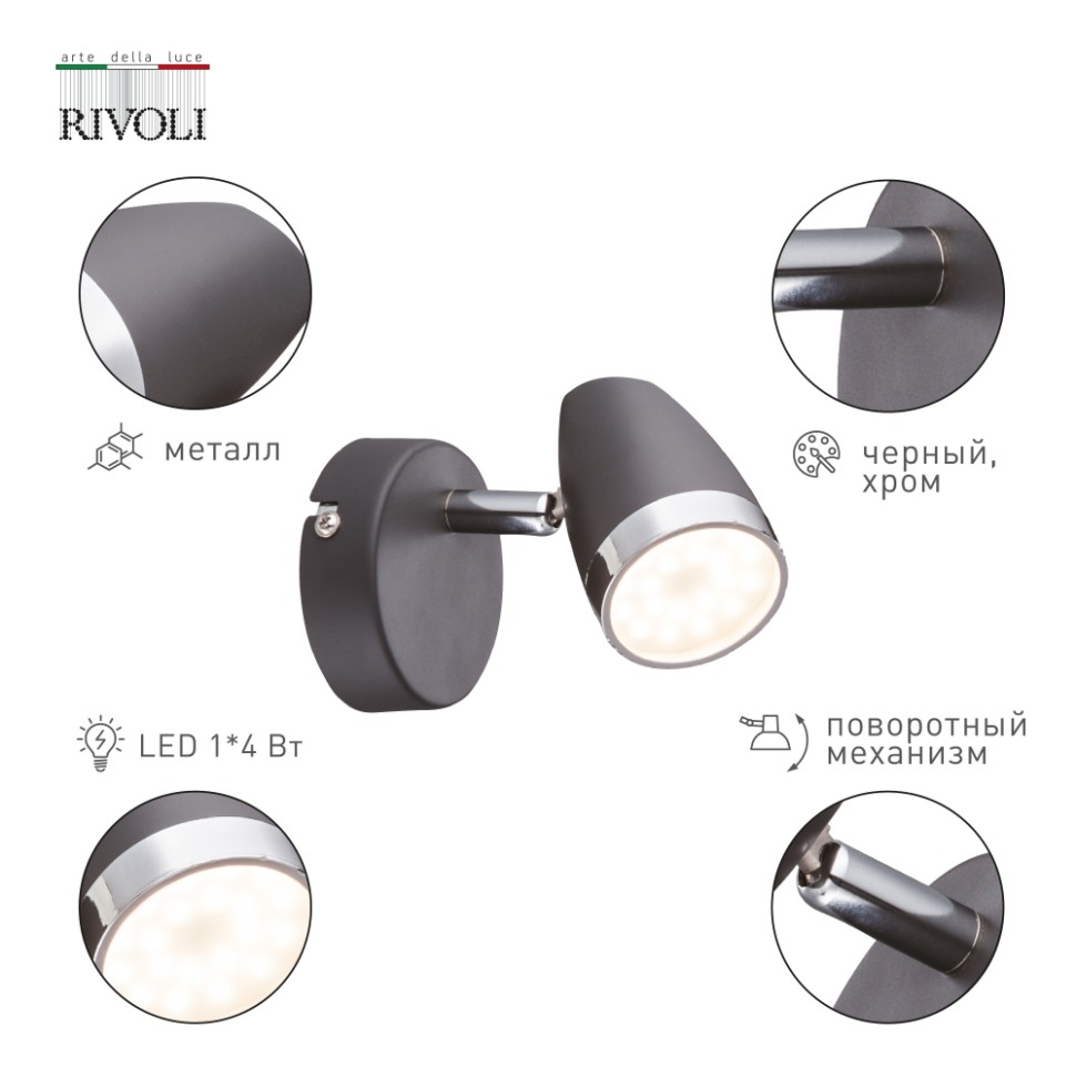 Rivoli Joyce (арт. 6156-701) - аккуратное поворотное LED бра серого цвета с хромированными деталями. Размеры бра - 125*80*96 мм. Компактный и стильный настенно-потолочный светильник поможет вам оформить интерьер в соответствии с современными трендами. Для этого функционального бра не нужна лампа, освещение создают встроенные светодиоды. Экономичные и стильные бра из прочного легкого металла. / Температура освещения - 3200 К. Это белый дневной свет с небольшим уклоном в сторону теплого рассветного. Такое освещение психологи рекомендуют для жилых помещений. В комнате с бра Rivoli Joyce вам будет уютно и комфортно! Спешите заказать ультрасовременный светильник-бра в спальню, детскую, прихожую, гостиную. / В коллекции итальянских дизайнерских светильников Rivoli Joyce вы найдете не только бра на стену, но и настенно-потолочные светильники с 2 плафонами (арт. 76704246), настенно-потолочные светильники с 3 плафонами (арт. 76704241). Все они работают на основе светодиодов. /