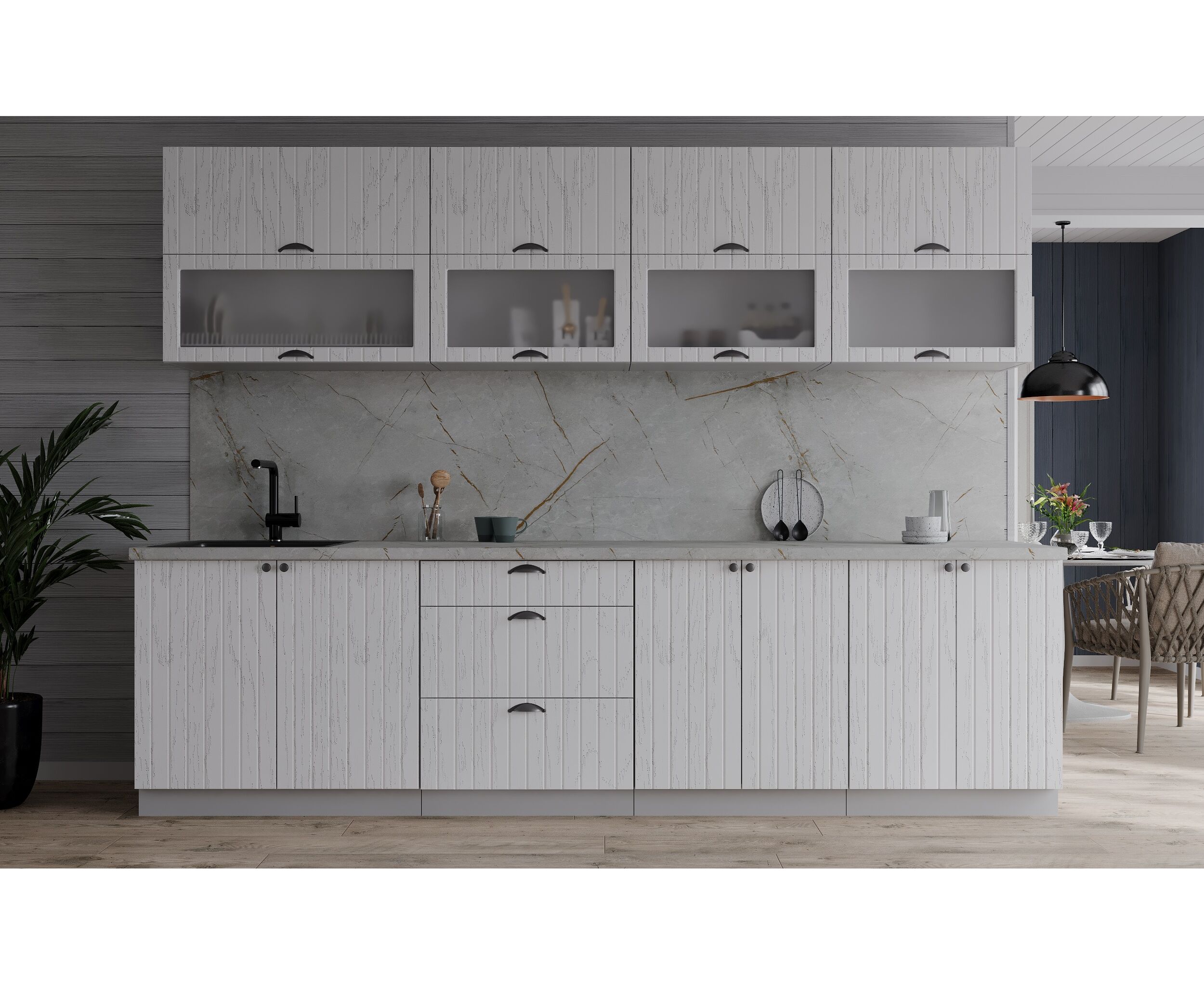 ОБРАТИТЕ ВНИМАНИЕ!!! 1. Данная модель кухни рассчитана ТОЛЬКО под врезную мойку! Столешница 38мм влагостойкая, поставляется одной, либо несколькими частями по желанию заказчика. 2. Системы выдвижения на шуфлядах применяются шариковые полного выдвижения. 3. Решетки для сушки посуды включены в основной комплект. 4. Для данной модели кухни предусмотрена модульная программа, что позволяет вносить изменения в стандартные готовые комплекты. Ассортимент и стоимость модулей уточняйте у менеджеров.