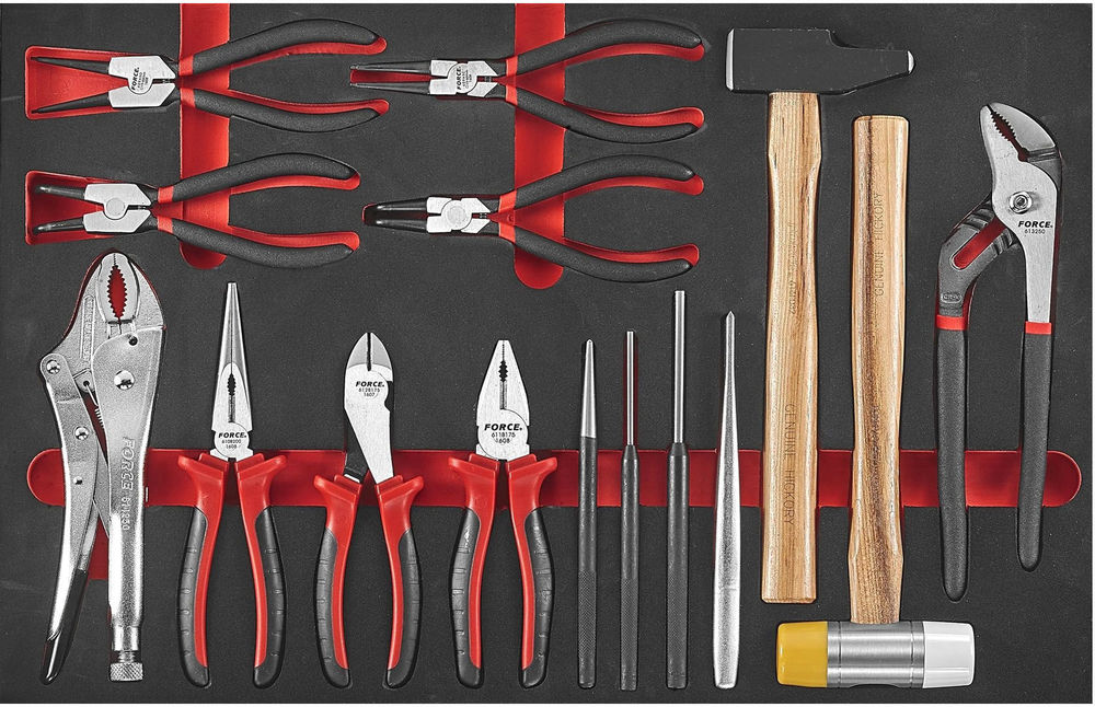 Набор из 15 предметов: Молоток клепальный 32 мм 650 гр.; Молоток рихтовочный с полиуретановым и нейлоновым бойками 400 гр.; Выколотки 4 мм (190 мм); 6 мм (210 мм); Керн слесарный 4 мм (185 мм); Бокорезы диагональные 175 мм - 7 ; Струбцына 250 мм - 10 ; Плоскогубцы 200 мм - 8 ; Пассатижи переставные 250 мм - 10 ; Щипцы для снятия стопорных колец отогнутые на 90°(сжим); Щипцы для снятия стопорных колец прямые (сжим); Щипцы для снятия стопорных колец отогнутые на 90°(разжим); Щипцы для снятия стопорных колец прямые (разжим)..