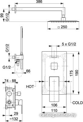 - Комплектация верхний душ, штанга, ручной душ (лейка), держатель лейки, шланг, смеситель