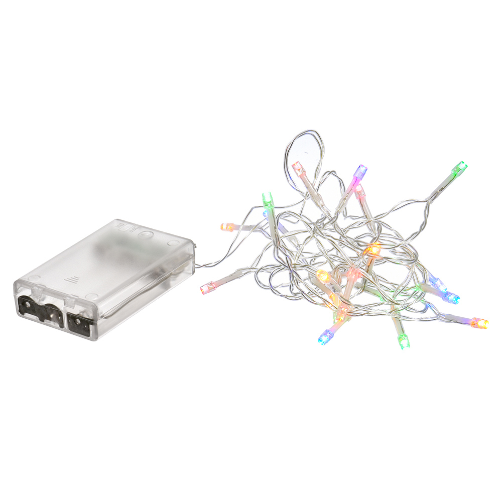 Длина гирлянды 2 м, количество светодиодов 20. Цвет свечения многоцветный, режим работы статичный, цвет провода прозрачный. Степень защиты IP 20. Мощность 1,2 W. Гирлянда включается при помощи тумблера on/off, расположенного на блоке питания. Для работы необходимы батарейки типа «АА» (в комплект не входят). Использовать при комнатной температуре. Срок службы 25 000 часов.