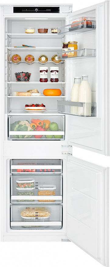 Встраиваемый, двухкамерный, компоновка морозильник внизу, класс энергопотребления A++, объем холодильной камеры 187 л, объем морозильной камеры 71 л, электронное управление, встроенные ручки, дисплей.