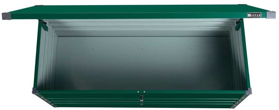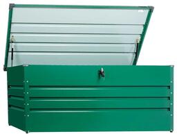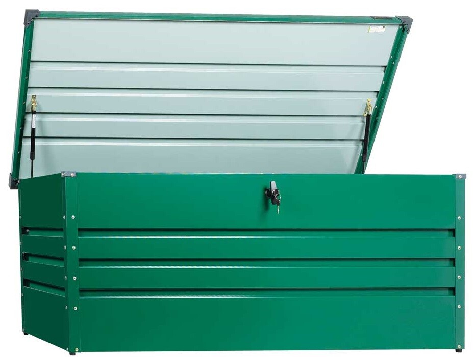 садовый металлический ящик зеленого цвета, оснащенный крышкой;