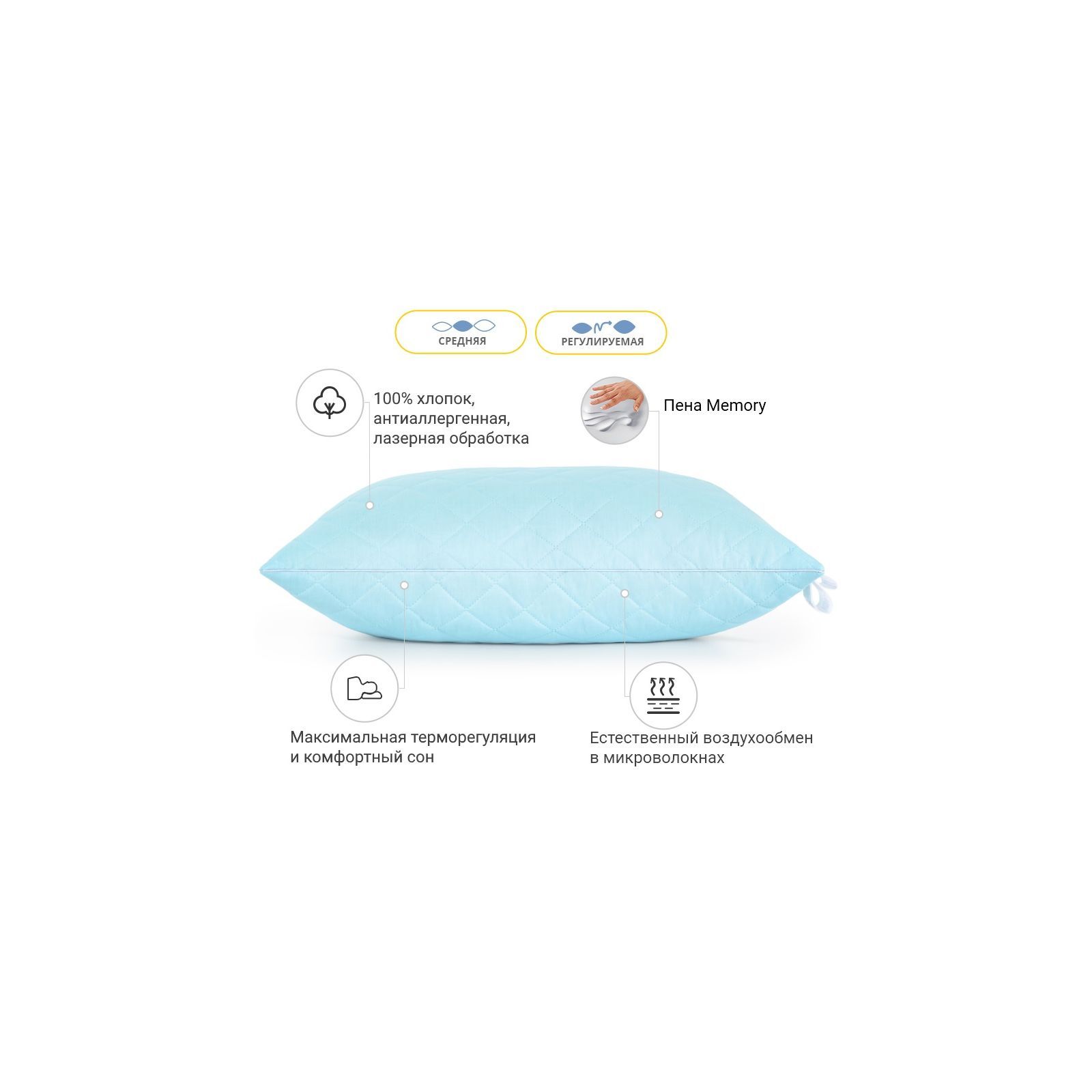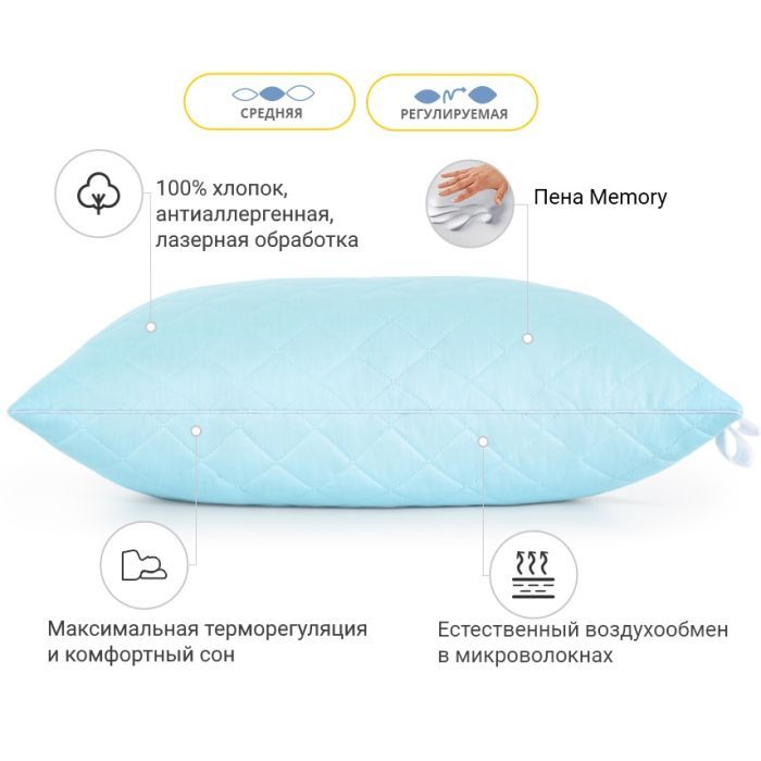 Середня — оптимально розрахована вага наповнювача для досягнення гарних показників за пружністю. Ця висота прекрасно підійде людям, які люблять середні, у міру пружні подушки. Подушку можна віднести до розряду стандартних, середніх за м'якістю та висотою. Також не хочеться втратити можливість підкреслити величезний плюс подушок — вони регульовані! Вся принадність у тому, що в подушці є вбудована блискавка (вона розмішена збоку подушки), завдяки якій ви в будь-який момент зможете вийняти трохи наповнювача та підлаштувати подушку повністю під себе.
