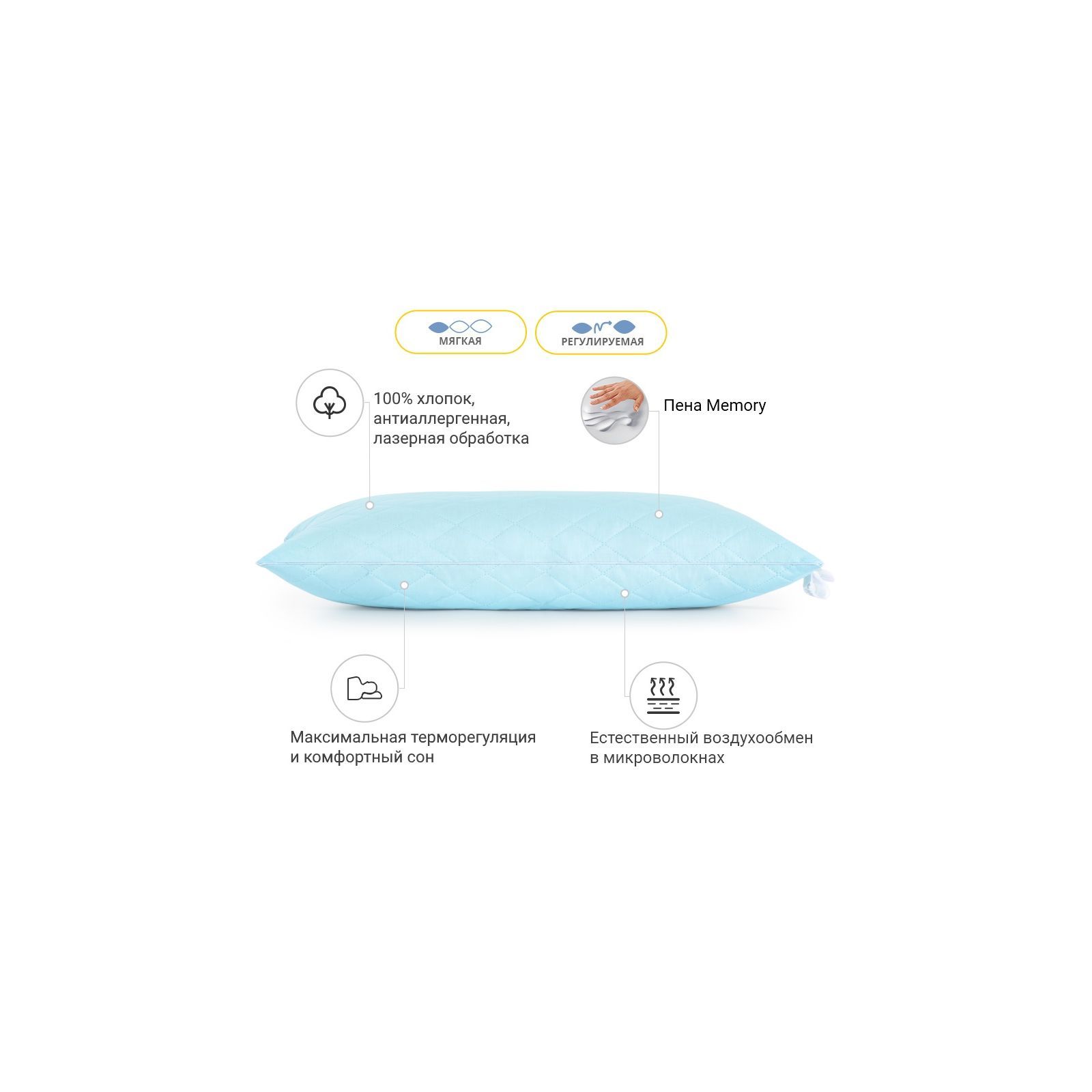 Низька — оптимально розрахована вага наповнювача для досягнення гарних показників за пружністю. Ця висота прекрасно підійде людям, які люблять низькі та дуже м'які подушки. Рекомендовано для дітей і жінок. Також не хочеться втратити можливість підкреслити величезний плюс подушок — вони регульовані! Вся принадність у тому, що в подушці є вбудована блискавка (вона розмішена збоку подушки), завдяки якій ви в будь-який момент зможете вийняти трохи наповнювача та підлаштувати подушку повністю під себе.