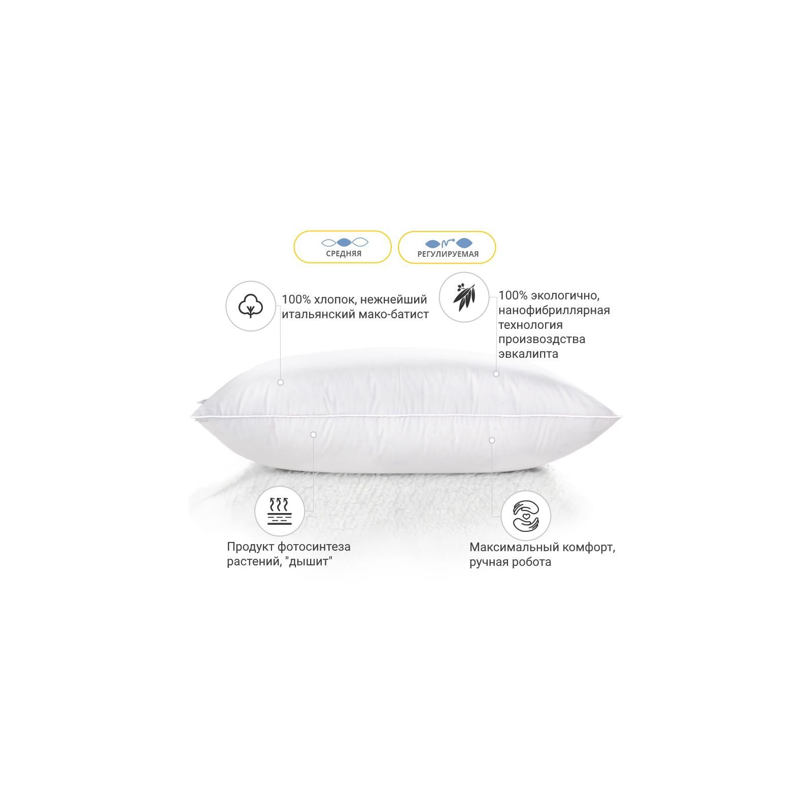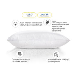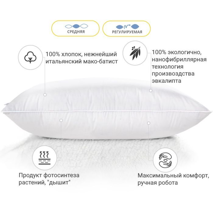 Середня — оптимально розрахована вага наповнювача для досягнення гарних показників за пружністю. Ця висота прекрасно підійде людям, які люблять середні, у міру пружні подушки. Подушку можна віднести до розряду стандартних, середніх за м'якістю та висотою. Також не хочеться втратити можливість підкреслити величезний плюс подушок — вони регульовані! Вся принадність у тому, що в подушці є вбудована блискавка (вона розмішена збоку подушки), завдяки якій ви в будь-який момент зможете вийняти трохи наповнювача та підлаштувати подушку повністю під себе.