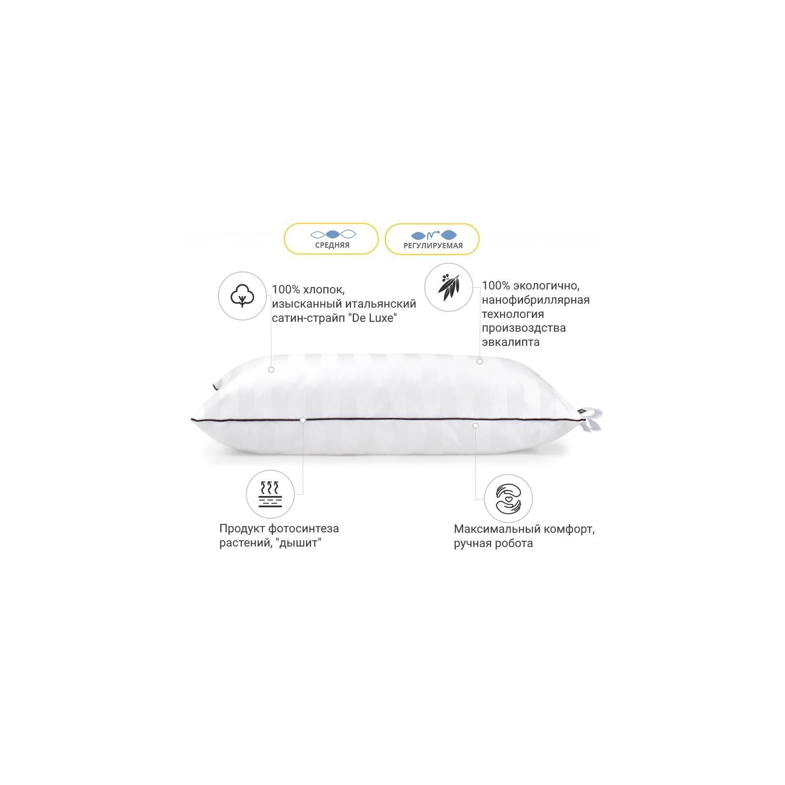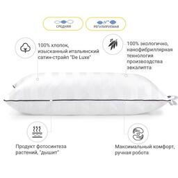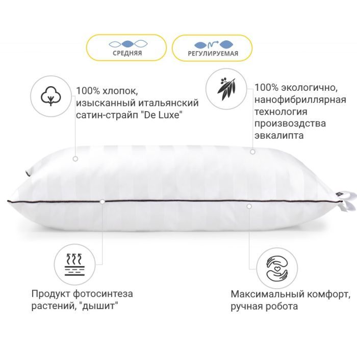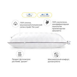 Середня — оптимально розрахована вага наповнювача для досягнення гарних показників за пружністю. Ця висота прекрасно підійде людям, які люблять середні, у міру пружні подушки. Подушку можна віднести до розряду стандартних, середніх за м'якістю та висотою. Також не хочеться втратити можливість підкреслити величезний плюс подушок — вони регульовані! Вся принадність у тому, що в подушці є вбудована блискавка (вона розмішена збоку подушки), завдяки якій ви в будь-який момент зможете вийняти трохи наповнювача та підлаштувати подушку повністю під себе.