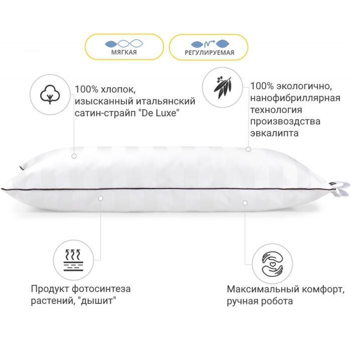 Низька — оптимально розрахована вага наповнювача для досягнення гарних показників за пружністю. Ця висота прекрасно підійде людям, які люблять низькі та дуже м'які подушки. Рекомендовано для дітей і жінок. Також не хочеться втратити можливість підкреслити величезний плюс подушок — вони регульовані! Вся принадність у тому, що в подушці є вбудована блискавка (вона розмішена збоку подушки), завдяки якій ви в будь-який момент зможете вийняти трохи наповнювача та підлаштувати подушку повністю під себе.
