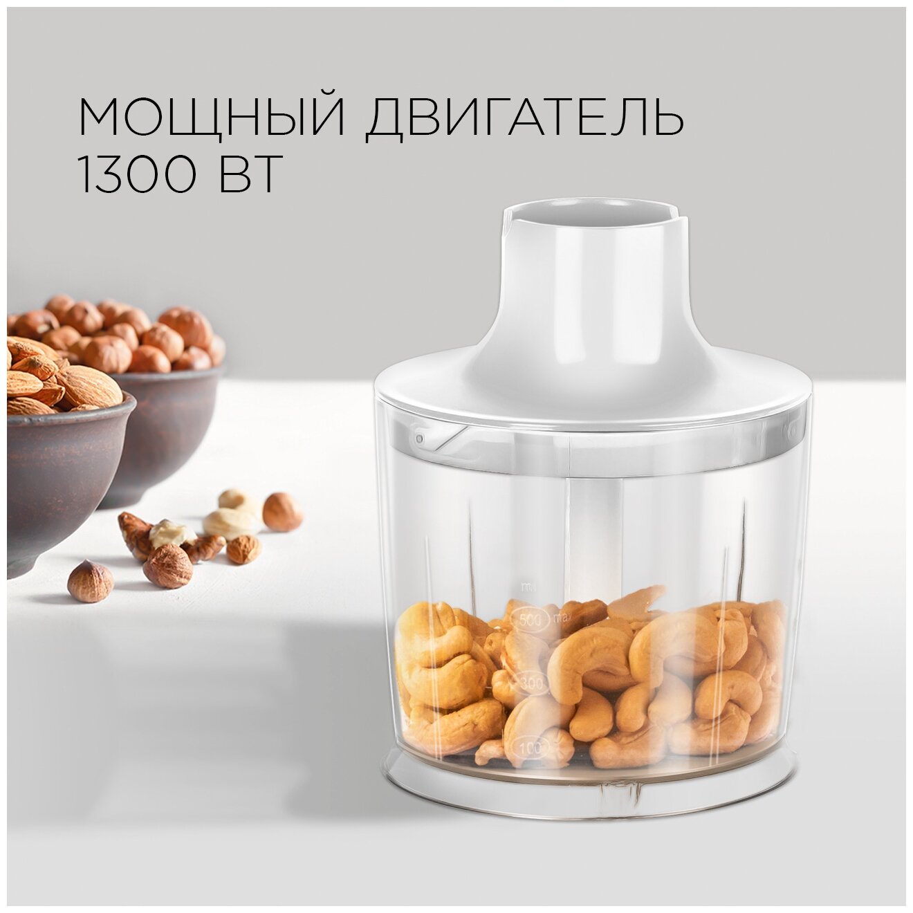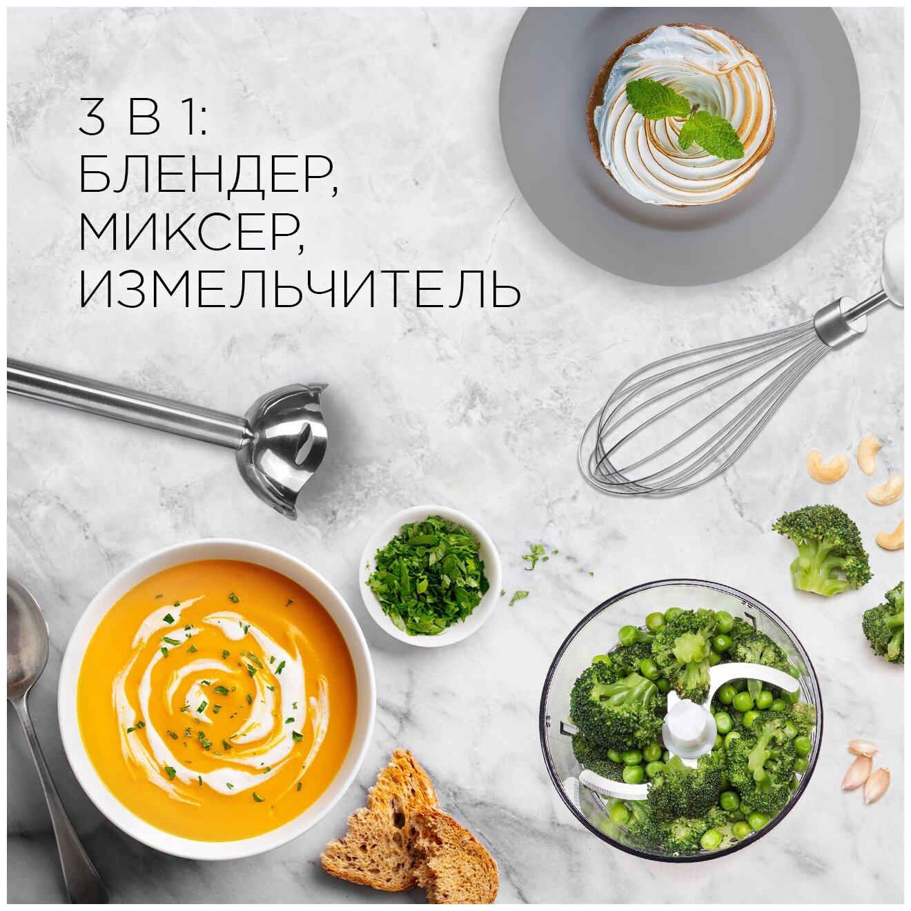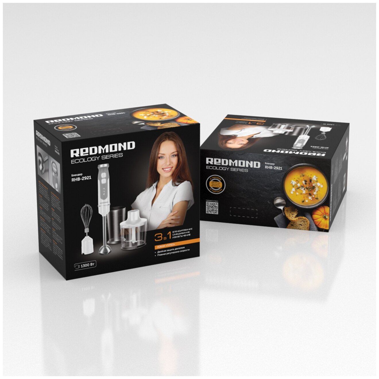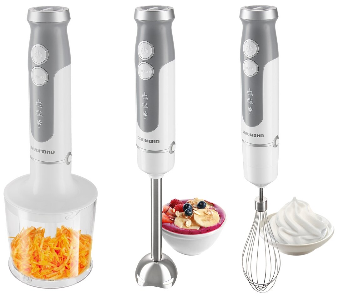 Redmond RHB-2921 — универсальный прибор «3 в 1» для блендирования, измельчения и взбивания ингредиентов. C помощью комплекта сменных насадок вы легко подготовите ингредиенты для множества любимых блюд. С погружным блендером вы можете быстро смешивать продукты для соусов, па шт.етов, смузи, коктейлей, детского питания и многого другого. Насадка из нержавеющей стали отлично подходит для обработки как горячих, так и холодных продуктов. С насадкой-венчиком вы легко взобьете яйца для омлета, белки или сливки для крема, основу для безе. В чаше измельчителя вы можете быстро обработать небольшую порцию мяса, твердый сыр, овощи и зелень. Острый S-образный нож из нержавеющей стали справится даже с твердыми орехами или специями.