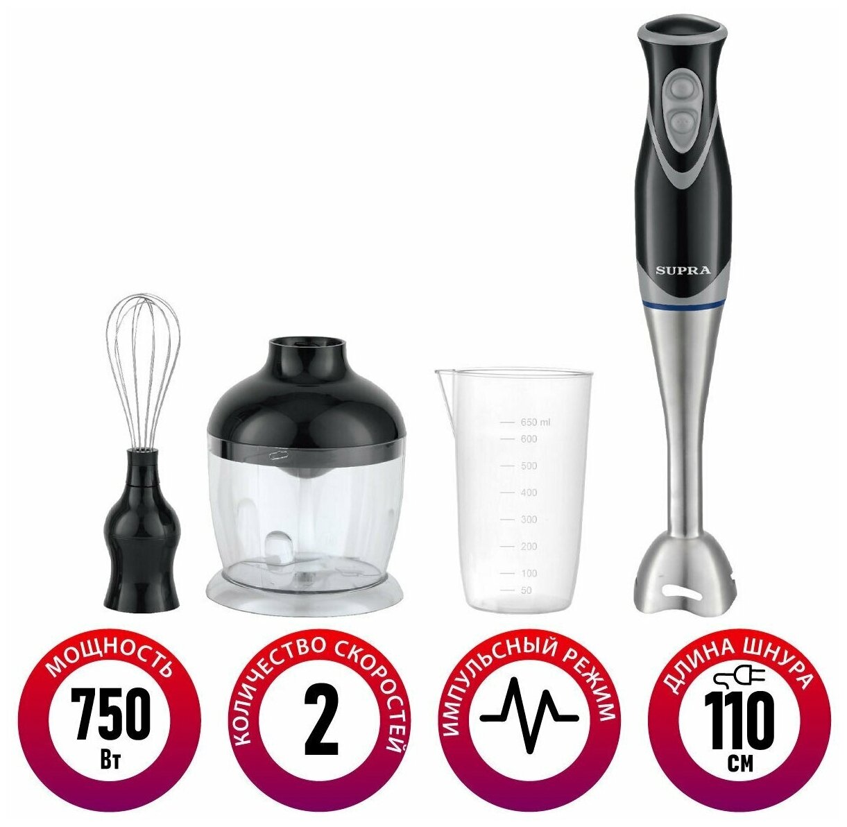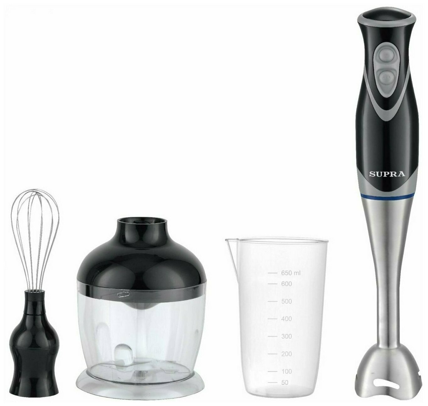 Блендер погружной SUPRA HBS-995 оснащен мощностью 750 Вт. В комплект входит съемная насадка-венчик, мини-измельчитель 750 мл, мерный стакан для взбивания 650 мл.